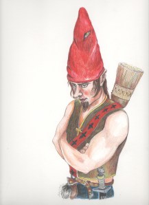 For the record and for comparison between the garden variety gnome and the real thing, my reference drawing of Oskar the Kobold is below. His story is complete and available, in case anyone wonders.