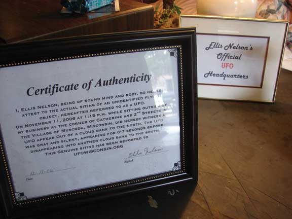 I visited and interviewed the nationally recognized, visionary artist Ellis Nelson of Muscoda for my book, “Strange Wisconsin,” not long after his sighting. Nelson is a semi-retired, self-taught metal sculptor. His front yard gallery on the edge of Muscoda teems with original versions of the Grim Reaper, various animals, and a stylized version of the UFO he saw fly overhead as he sat outdoors in his lawn chair one day that year.
